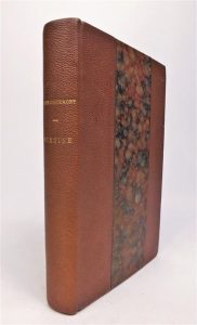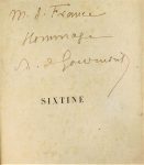 GOURMONT (Remy de). SIXTINE. Roman de la vie cérébrale. Paris, Albert Savine, 1890. In-12, demi-chagrin violine, à bande, couvertures conservées (reliure postérieure). EDITION ORIGINALE. Exemplaire avec un fac-similé d'une page manuscrite, il est enrichi d'un envoi signé de Gourmont à M. Anatole France. Quelques rousseurs.