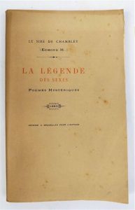 HARAUCOURT (Edmond). LA LEGENDE DES SEXES. POEMES HYSTERIQUES. Bruxelles, pour l'auteur, 1882. In-8 broché. Rare édition originale de ce recueil de 39 poèmes érotiques, qu'Edmond Haraucourt définit comme l'épopée du bas ventre. Il fut composé sous le pseudonyme de sire de Chambley. Edition imprimée à Bruxelles pour l'auteur, portant l'achevé d'imprimer à la date du 15 avril 1883, le titre et la couverture étant datés de 1882. Exemplaire orné de 12 belles eaux-fortes, libres et parfois macabres. Tirage à 200 exemplaires non mis dans le commerce, celui-ci sur Arches. Bon exemplaire (pas dans Pia ni dans Dutel).