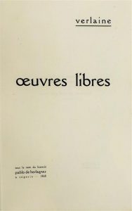 HERLAGNEZ (Pablo de) - VERLAINE. Ouvres libres. Sous le nom du licencié Pablo de Herlagnez à Ségovie, 1868. In-8 en feuilles sous chemise de l'éditeur. Édition tirée à 400 exemplaires publiée vers 1930, selon Pia et Dutel, et réunissant les recueils Amies, Femmes et Hombres. Chaque poème est orné d'une jolie lettrine érotique gravée sur bois. Bon exemplaire. (Dutel, 2092).