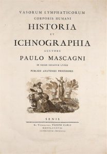 MASCAGNI (Paulo). VASORUM LYMPHATICORUM CORPORIS HUMANI HISTORIA ET ICHNOGRAPHIA. Sienne, Pazzini Carli, 1787. Grand in folio de 140 pages et 41 planches, demi velin (reliure de l'époque). Première édition illustrée de 41 SPECTACULAIRES PLANCHES GRAVEES, dont 15 au trait simple ; elles ont été dessinées d'après nature et gravées par Cyrus Sanctius. « Mascagni made several discoveries regarding the lymphatics. His beautiful atlas gained him lasting fame » (G.M. 1104). Manque de velin en haut et bas du dos, l'exemplaire, imprimé sur papier fort est très frais intérieurement.