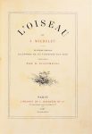 MICHELET (Jules). L'OISEAU. Huitième édition illustrée de 210 vignettes sur bois. Paris, Hachette, 1867. Grand in-8, demi-maroquin bleu à coins, dos à nerfs orné de fers dorés représentant des oisillons dans un nid, t. dorée, couv. et dos (P. Affolter). Première édition illustrée de 210 vignettes par H. Giacomelli. Bel exemplaire joliment orné de fers spéciaux. (Vicaire V, 833).