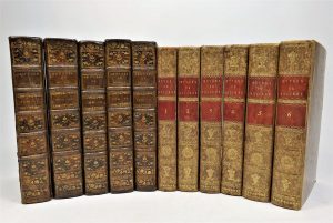 MOLIÈRE. OUVRES, avec des remarques grammaticales, des avertissements et des observations sur chaque pièce, par M. Bret. Paris, Compagnie des libraires associés, 1788. 6 volumes in-8, veau marbré, triple filet doré, dos lisse orné, tranches dorées (Reliure de l'époque). Belle réimpression de la célèbre illustration par Moreau le Jeune. Elle comprend un portrait gravé par Cathelin et 33 belles planches hors-texte gravées en taille-douce d'après Moreau. Légers frottements sinon bon exemplaire. On joint : BOILEAU. Ouvres par M. de Saint Marc. Paris, Libraires associés, 1777. 5 volumes in-8, veau écaille, charnières faibles (reliure de l'époque). Ensemble 11 volumes.