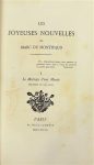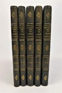 MONTIFAUD (Marc de). LES JOYEUSES NOUVELLES. Paris, sans nom, 1882-83. 10 tomes reliés en 5 volumes in-12, demi chagrin bleu-vert, dos à nerfs orné (reliure de l'époque). Collection complète de ces 10 petits contes drolatiques, d'esprit grivois et anticlérical ; chacun est précédé d'une jolie eau-forte annonçant le thème du conte. Marc de Montifaud est le pseudonyme littéraire de Marie-Amélie Chartroule de Montifaud ; ses écrits osés lui valurent une condamnation à la prison.