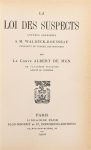 MUN (Comte Albert de). LA LOI DES SUSPECTS. Lettres adressées à M. Waldeck-Rousseau. Paris, Plon, 1900. In-12, maroquin chaudron, plats ornés d'armoiries dorées, doublés de maroquin vert avec un large encadrement doré, gardes de moire verte, tranches dorées (G. Bénard). Edition originale. L'ouvrage est orné sur les plats des armes de la famille de Laborde et de Creuzé de Lesser, et enrichi de la carte de visite écrite du Père du Lac, confesseur de l'auteur. Ex libris de la Baronne de Lesser. TRES BEL EXEMPLAIRE RELIE PAR GUILLAUME BENARD, MAITRE DE CHARLES MEUNIER.