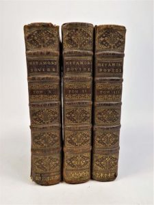 OVIDE. LES METAMORPHOSES mises en vers françois. Paris, Vve de Claude Thiboust, 1697. 3 volumes in-12, basane brune, dos à nerfs orné (reliure de l'époque). Première édition complète de la traduction française en vers, par Thomas Corneille. L'illustration comprend 177 vignettes à mi page gravées à l'eau-forte par François Ertinger, en premier tirage. Défauts aux reliures, cernes clairs.