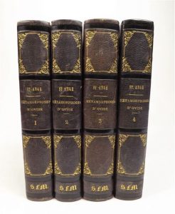 OVIDE. LES METAMORPHOSES, traduites en vers avec des remarques et des notes par M. Desantange. Paris, Desray, 1818. 4 volumes in-8, demi chagrin violine, dos orné de fers dorés, initiales dorées S.F.M. en bas du dos (reliure du XIX°). Illustrée de 141 gravures, dont un portrait en frontispice, gravées au burin sur les dessins des meilleurs peintres de l'école française, Moreau le jeune et autres. Tampon maçonnique en bleu sur quelques feuillets. Quelques rousseurs.