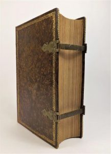 RIBADENEIRA (Pedro de). LES FLEURS DES VIES DES SAINCTS ET FESTES de toute l'année suivant l'usage du calendrier romain réformé. Douay, de l'imprimerie de Baltazar Bellere, 1630. 2 parties en 1 fort volume in folio, basane racinée, dentelle dorée sur les plats, fermoirs ciselés (Polvèche, relieur à Lille). Imposant volume de plus de 1500 pages. Réparations en marge de nombreux feuillets, la reliure est en parfait état avec les fermoirs d'origine.
