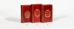 1 volume in 8,reliure de l'époque en maroquin rouge à grains longs, fines dentelles d'encadrement, pièces d'armes aux angles, grandes armes au centre sur les plats.