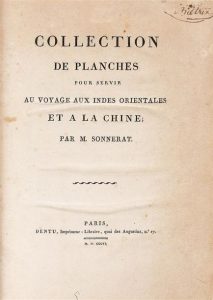 SONNERAT (Pierre). COLLECTION DE PLANCHES POUR SERVIR AU VOYAGE AUX INDES ORIENTALES ET A LA CHINE. Paris, Dentu, 1806. In-4°, demi basane fauve, dos à nerfs (reliure postérieure). Atlas seul composé de 140 PLANCHES GRAVEES, certaines dépliantes, représentant des vues de villes, personnages, divinités, cérémonies, animaux, plantes,... Traces d'insolation au dos sinon, bel état intérieur.