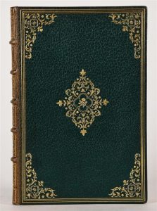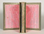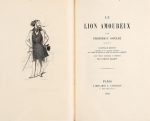 SOULIÉ (Frédéric). LE LION AMOUREUX. Paris, Librairie L. Conquet, 1882. In-12 maroquin vert émeraude, plats ornés de larges fleurons d'angle avec motif doré au centre, triple filet, dos à nerfs richement orné, large dentelle intérieure, gardes de moire rose, t. dorée, couv. (Pierson). EDITION ORIGINALE, c'est l'un des 150 exemplaires sur grand papier du Japon, illustré de 19 vignettes dessinées par SAHIB et gravées au burin par Nargeot, avec une notice historique et littéraire par L. Halévy. Dos légèrement passé sinon très bel exemplaire à grandes marges.
