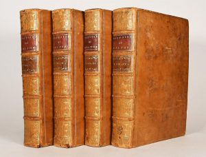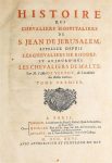 VERTOT (René d'Aubert de). HISTOIRE DES CHEVALIERS HOSPITALIERS DE St. JEAN DE JERUSALEM, appellez depuis les chevaliers de Rhodes, et aujourd'hui les chevaliers de Malte. Paris, Rollin, Quillau, Desaint, 1726. 4 volumes in-4°, veau blond, triple filet doré sur les plats, dos à nerfs très orné, tranches dorées sur marbrure (reliure de l'époque). PREMIERE EDITION. Elle est ornée d'un portrait de l'auteur, de 6 cartes et plans dont 5 dépliants et de 70 portraits des chevaliers. On notera parmi ceux-ci l'unique portrait de femme, celui de la réformatrice Galiote de Saint-Anne de Genouillac de Vaillac, prieure du couvent des Fieux, près de Miers, couvent relevant de l'ordre de Malte. 2 coiffes usées, l'exemplaire est agréablement relié en veau blond de l'époque.