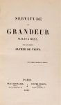 VIGNY (Alfred de). SERVITUDE ET GRANDEUR MILITAIRES. Paris, Félix Bonnaire, Victor Magen, 1835. In-8, basane vermillon, plats ornés d'une dentelle à froid et de filets dorés encadrant un grand fleuron romantique, dos à nerfs très orné, dentelle dorée intérieure, tranches dorées, étui bordé (Bernasconi). EDITION ORIGINALE rare et recherchée selon Clouzot. Bel exemplaire dans une jolie reliure de style romantique exécutée par Bernasconi, relieur suisse (1879-1967). De la bibliothèque de Edouard Rastoin (ex-libris daté de 1936).
