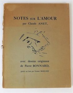 ANET (Claude). NOTES SUR L'AMOUR... avec dessins originaux de Pierre Bonnard, gravés sur bois par Yvonne Mailliez. Paris, G. Crès, 1922. In-4°, broché. Edition ornée de 9 dessins (8 à pleine page et un en couverture) de PIERRE BONNARD gravés sur bois par Yvonne Mailliez. Dos fendu. Tirage d'édition non numéroté sur papier bouffant.