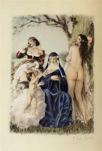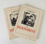 ARETIN (L'). LES RAGIONAMENTI. Paris, la Nef d'Argent, 1944. 2 volumes in-8 brochés, couvertures illustrées. Orné de 2 frontispices et de 30 aquarelles coloriées au pochoir et rehaussées de gouache de PAUL ÉMILE BECAT. Exemplaire numéroté sur pur fil Chiffon. Menus défauts.