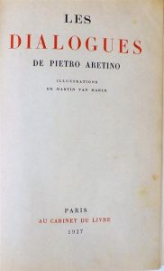 ARETIN (Pierre L'). LES DIALOGUES. Paris, Cabinet du Livre, 1927. In-8, demi-percaline rouge. Nombreuses illustrations légères de MARTIN VAN MAELE. Exemplaire numéroté sur Hollande. Rousseurs, reliure salie.