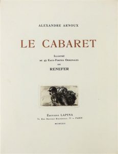 ARNOUX (Alexandre). LE CABARET. Paris, Lapina, 1922. In-4° broché, étui. 49 eaux-fortes originales in et hors-texte de RENEFER. Exemplaire numéroté sur Hollande portant la signature de l'auteur et de l'artiste, avec le bulletin de souscription illustré. Menus défauts.