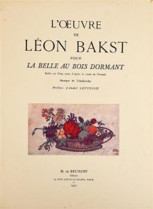 [BAKST]. L'OUVRE DE LEON BAKST POUR LA BELLE AU BOIS DORMANT. Paris, Brunoff, 1922. In-folio, broché, couvertures rempliées. Luxueuse publication, tirée à 500 ex. sur Arches, reproduisant en couleurs 54 planches de costumes et décors créés par Léon BAKST pour ce ballet mis en musique par Tchaïkovsky. Il est orné également de 2 vignettes en couleurs et d'un portrait de l'artiste en noir par Pablo Picasso. Tirage à 500 exemplaires, celui-ci le n°473 signé par l'auteur et l'illustrateur. Petites piqures, bel exemplaire.