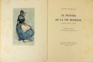 BAUDELAIRE (Charles). LE PEINTRE DE LA VIE MODERNE. CONSTANTIN GUYS. Paris, Kieffer, 1923. In-4°, broché. Reproduction intégrale des16 planches hors texte de CONSTANTIN GUYS, en noir ou en couleurs. Tirage à 550 exemplaires, celui-ci un des 500 sur vélin. Quelques rousseurs.