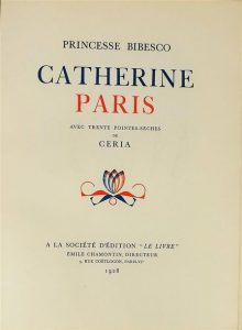 BIBESCO (Princesse). CATHERINE PARIS. Paris, Le Livre, 1928. In-4°, broché, non rogné. Première édition illustrée, ornée de 30 délicates pointes-sèches de CERIA, montrant de ravissants tableaux de Paris. Tirage à 350 exemplaires, celui-ci numéroté sur velin de Hollande.