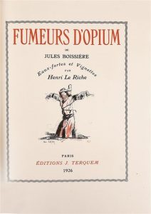 BOISSIÈRE (Jules). FUMEURS D'OPIUM. Eaux- fortes et vignettes par Henri Le Riche. Paris, J. Terquem, 1926. In-4°, maroquin vert sapin, large encadrement intérieur composé de filets noirs alternant avec des filets au palladium, gardes de moire rouge, dos à nerfs, t. dorée, couv. et dos, étui bordé (Gruel). Beau livre illustré d'un frontispice en couleurs, 9 eaux-fortes hors texte, et plusieurs vignettes dans le texte par HENRI LE RICHE. Édition strictement limitée à 152 exemplaires numérotés, tous sur vélin du marais fabriqué spécialement à la main et paraphés par l'éditeur. L'un des 130 contenant les eaux-fortes en noir et une suite avec remarques tirée en sanguine. Deux petits accrocs au dos, passé, la reliure signée Gruel est finement exécutée.