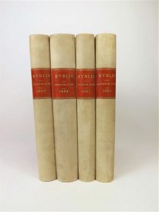 BYBLIS, MIROIR DES ARTS DU LIVRE ET DE L'ESTAMPE. Paris, Albert Morancé, 1922-1925. 4 volumes in-4°, demi velin ivoire, couvertures conservées (reliure de l'époque). Luxueuse revue, d'une haute tenue artistique et documentaire destinée à l'élite des connaisseurs. Du numéro 1 (Hiver 1921-22) au numéro 16 (Hiver 1925). Chaque fascicule (4 par année) est illustré de plusieurs hors-texte en noir ou en couleurs par les meilleurs artistes de l'époque. UN DES 100 EXEMPLAIRES nominatifs et numérotés sur velin d'Arches. Bel état.