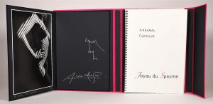 CLERGUE (L) - ARRABAL (F). JOYAU DU SPASME. Nus de Lucien Clergue. Tatoués par Fernando Arrabal. Fontaine de Vaucluse, le renard pâle, 2009. In-4°, soie rose de l'éditeur. Edition originale tirée à 30 exemplaires seulement, tous numérotés et signés par les artistes. Elle contient huit photographies de Lucien Clergue, avec serpente imprimée des tatouages d'Arrabal et accompagnée d'une épreuve argentique, le tout présenté dans un étui de soie confectionné par Bernard Soria. Parfait état.