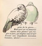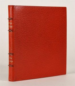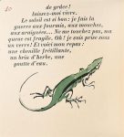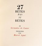 COSTER (Germaine de). 27 BETES PAS SI BETES. Présenté par Marcel Aymé (Paris, s.n.) 1950. In-12 carré, maroquin janséniste cerise, doublure de maroquin gris, garde de soie rouge, double garde, tranches dorées, couvertures et dos, étui bordé (Semet et Plumel). Edition originale très rare de ces « courts poèmes en prose, dont chacun présente la confidence d'un animal » et « où il s'agit presque toujours d'un portrait moral ou social (M. Aymé) », elle est ornée de 27 fines compositions de GERMAINE DE COSTER gravées sur bois de fil dont 15 en couleurs. Tirage limité à 116 exemplaires numérotés, imprimés sur les presses de Daragnès « qui surveilla la composition jusqu'à sa mort », celui-ci l'un 20 sur Torinoko, enrichi d'une suite en noir sur Japon dont une signée par l'artiste. Magnifique exemplaire parfaitement établi.