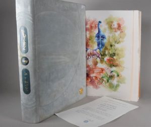 CYRANO DE BERGERAC. LE VOYAGE DANS LA LUNE. Monte Carlo, Arts et Couleurs, 1979. Grand in-folio en feuilles, sous emboîtage de daim gris-bleu de l'éditeur. Illustré de 10 gouaches originales et uniques de l'artiste MYRIAM BERING (signées et datées au crayon), qui consacra 20 ans de sa vie à la réalisation de cet ouvrage d'exception. Tirage à 223 exemplaires, celui-ci l'un des 40 exemplaires numérotés en chiffres romains et enrichis d'une grande gouache encadrée (absente) et d'un dessin original à l'encre et gouache blanche, signé. Bel état.