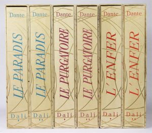 DANTE. LA DIVINE COMEDIE. L'ENFER - LE PURGATOIRE - LE PARADIS. Illustrations de Dali. Paris, Les Heures Claires, 1963. 6 volumes in-4°, en feuilles, sous chemises et étuis illustrés de l'éditeur. Célèbre édition ornée de 100 planches en couleurs gravées sur bois de SALVADOR DALI. Exemplaire numéroté sur vélin pur chiffon (n°1506). Légers défauts aux étuis, rares rousseurs.