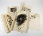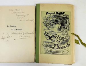 DAYOT (Armand). LE VERTIGE DE LA BEAUTE. Paris, Eugène Dété, 1906. In-8, broché, étui toilé de l'époque. Édition ornée de 72 compositions de CHARLES JOUAS gravées sur bois par Eugène Dété, dont 12 hors-texte en camaïeu. Tirage à 151 exemplaires, celui-ci un des 20 sur japon non justifié avec une suite de 104 compositions (80 in texte et 24 hors texte en 2 états). Enrichi de 5 GRANDS DESSINS ORIGINAUX SIGNES PAR L'ARTISTE (gouache, pastel et crayon), et de dédicaces signées de l'auteur, l'artiste et le graveur adressées à l'imprimeur G. Dumontier ; c'est très probablement l'exemplaire de ce dernier. Les illustrations sont conservées dans un portefeuille cartonné illustré. Bon exemplaire.