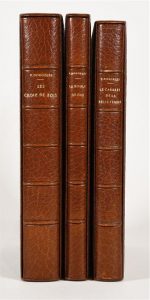 DORGELES (Roland). LES CROIX DE BOIS - LA BOULE DE GUI - LE CABARET DE LA BELLE FEMME. Paris, Éditions de la Banderole, 1921-22-24. 3 vol. in-4°, demi-maroquin acajou à coins, dos à nerfs, têtes dorées, couvertures et dos, étuis bordés. Premières éditions illustrées. Elles s'ornent de nombreux dessins et pointes sèches originales par ANDRE DUNOYER DE SEGONZAC. Tirage à 600 exemplaires, « Les croix de bois » sur Lafuma, enrichi d'une épreuve d'artiste numérotée et signée, les deux autres numérotés sur Hollande et Lafuma. Les reliures, non signées, sont d'excellente facture.
