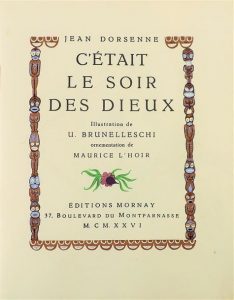 DORSENNE (Jean). C'ETAIT LE SOIR DES DIEUX. Illustration de Brunelleschi, ornementation de Maurice L'hoir. Paris, Mornay, 1926. In-8, broché. Remarquable illustration composée de 12 hors-texte de BRUNELLESCHI et d'ornements coloriés au pochoir par SAUDE. L'un des 350 numérotés sur Hollande (n° 92), enrichi de 2 suites en noir (Japon et Chine) et d'un DESSIN GOUACHE ORIGINAL d'un cul de lampe. Petites piqures.