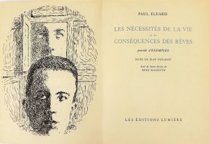 ELUARD (Paul). LES NECESSITES DE LA VIE ET LES CONSEQUENCES DES REVES. Paris, éditions Lumière, 1946. In-8, en feuilles sous chemise, emboitage. Seconde édition identique à la première parue à Paris « au sans pareil » en 1921, elle est illustrée de 12 dessins en noir à pleine page de RENE MAGRITTE. Tirage à 515 exemplaires sur velin, celui-ci hors-commerce réservé à l'éditeur. Ex-libris bibliothèque Jacques Odry. Emboitage fatigué, sinon bon état.
