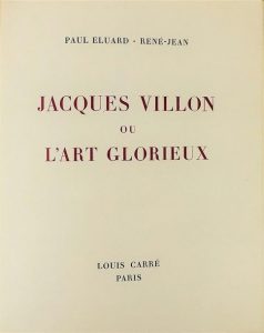ELUARD (Paul) - RENE-JEAN. JACQUES VILLON ou l'art glorieux. Paris, Louis Carré, 1948. In-4° broché, sous chemise et étui de l'éditeur. Édition originale tirée à 1800 exemplaires numérotés sur vélin du Marais (n°?853). 7 lithographies en couleur hors texte, dont 3 à double page.