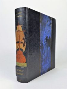 FARRERE (Claude). THOMAS L'AGNELET GENTIHOMME DE FORTUNE. Paris, Mornay, 1928. In-8, demi-maroquin bleu marine à bandes, dos orné d'un voilier mosaïqué, tête dorée, couvertures et dos, entièrement non rogné (A. Gresle). Illustrations in et hors-texte coloriées au pochoir de PIERRE NOËL. LE PREMIER DES 52 EXEMPLAIRES NUMEROTES SUR JAPON IMPERIAL. Belle reliure décorative.