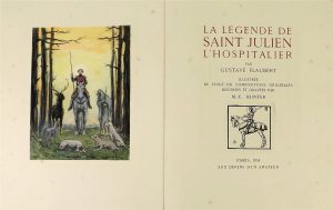 FLAUBERT (Gustave). LA LEGENDE DE SAINT JULIEN L'HOSPITALIER. Illustrée par M.E. Hunter. Paris, Aux dépens d'un amateur, 1934, In-4° en feuilles sous chemise et étui de l'éditeur. Edition de luxe tirée à 150 exemplaires, et orné de 26 planches en couleurs par HUNTER. Un des 15 exemplaires non mis dans le commerce, signé par l'artiste et par A. Drouet, architecte du livre. Rousseurs éparses, étui frotté.