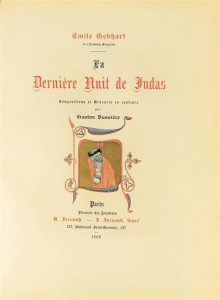 GEBHART (Émile). LA DERNIERE NUIT DE JUDAS. Paris, Ferroud, 1908. Grand in-8° broché. Bel ouvrage orné à chaque page d'encadrements inspirés par la faune fantastique ; il est illustré de belles eaux-fortes par Gaston BUSSIÈRE. UN DES 75 SUR JAPON contenant un état supplémentaire des illustrations. Bon exemplaire.