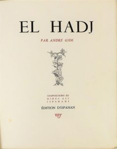 GIDE (André). EL HADJ. Paris, NRF, 1932. In-4°, broché, non rogné. 24 miniatures persanes en noir, rose et gris de MIRZA ALI ISPAHANI. Très bon exemplaire numéroté sur vélin d'Arches.