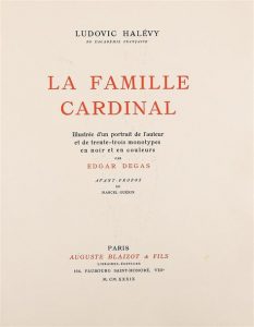 HALÉVY (Ludovic). LA FAMILLE CARDINAL. Illustrée d'un portrait de l'auteur et de trente-trois monotypes en noir et en couleurs par Edgar Degas. Paris, Blaizot, 1939. In-4°, broché, chemise et étui cartonné. Très belle édition illustrée par EDGAR DEGAS d'un portrait de l'auteur en frontispice et de 33 monotypes dont 2 dans le texte, 6 hors texte et 25 à pleine page, le tout reproduit à l'eau-forte en noir et en couleurs par le peintre et graveur Maurice Potin, dans son atelier. Tirage unique à 350 exemplaires numérotés sur papier vélin de Rives. Excellente condition.