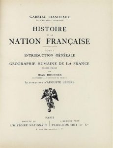 HANOTAUX (Gabriel). HISTOIRE DE LA NATION FRANCAISE. Paris, Nourrit. 1920-1924. 15 volumes in-4°, demi basane fauve à coins, dos lisses ornés, tranches rouges. Nombreuses illustrations in et hors-texte en noir et en couleurs D'AUGUSTE LEPERE, MATHURIN MEHEUT, HOOFBAUER, RIPART, etc... Bon exemplaire.