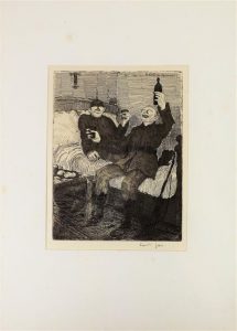 JOU (Louis). SPOLIUM. [Paris, Le Prince, 1915]. In-folio, sous portefeuille de l'éditeur Recueil de 15 eaux-fortes signées de LOUIS JOU, dont une reprise de l'illustration du titre. Toutes sont sur la guerre et sont sous passe-partout. TIRAGE A 100 EXEMPLAIRES, celui-ci un des 75 sur Hollande.