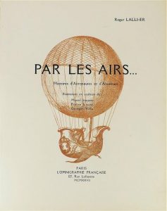 LALLI-ER (Roger). PAR LES AIRS... HISTOIRES D'AERONAUTES ET D'AVIATEURS. Paris, L'Omnigraphie Française, 1927. In-4°, broché. Historiettes ornées de 6 planches coloriées au pochoir par Marcel Jeanjean, Pierre Lissac et Georges Villa. Tirage à 314 exemplaires, celui-ci l'un des 200 numérotés sur Arches, enrichi d'un envoi signé de l'auteur à Xavier Jarre.
