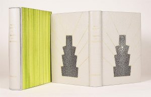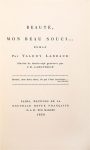 LARBAUD (Valéry). BEAUTE, MON BEAU SOUCI... Paris, Editions de la Nouvelle revue Française, 1920. In-8, maroquin gris, plats ornés d'un décor d'escalier en galuchat verni et serti d'un filet doré, dos lisse, doublures de box vert amande, gardes de daim gris clair, t. dorée, couv. et dos, chemise à dos de maroquin, étui (A. Butré). Edition originale illustrée par Jean-Emile Laboureur, dont c'est ici l'une des meilleures productions, et considérée comme l'une de ses réussites majeures. Les 39 burins d'une grande délicatesse s'allient parfaitement avec le texte de Larbaud et avec le décor finement exécuté par la relieur et artiste peintre Anick Butré. Tirage limité à 412 exemplaires numérotés, tous sur velin de Navarre. Légère restauration à la couverture, l'exemplaire est dans une condition parfaite.
