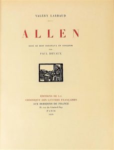 LARBAUD (Valery). ALLEN. Paris, La chronique des lettres françaises, 1929. In-8, demi-velin bradel ivoire, titre calligraphié au dos et dessin, couvertures et dos conservés. Édition ornée de 11 bois originaux de PAUL DEVAUX, dont 8 en couleurs. L'UN DES 50 EXEMPLAIRES NUMEROTES SUR JAPON IMPERIAL avec une planche supplémentaire numérotée et signée et une suite des bois. Piqures sur la reliure. Bon exemplaire non rogné.
