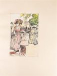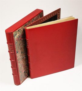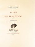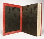 LAVEDAN (Henri). DE PARIS AU BOIS DE BOULOGNE. Paris, Imprimé pour Jean Borderel, 1908. In-4°, maroquin rouge janséniste, dos à nerfs, large encadrement intérieur de maroquin orné de deux triples filets dorés avec au centre une guirlande florale dorée, doublure et garde de soie brochée, doubles gardes, tranches dorées sur témoins, couvertures et dos, chemise et étui (Mercier, succ. de Cuzin). Edition originale illustrée de 22 fines eaux-fortes en couleurs à pleine page par TONY MINARTZ. Rare exemplaire non justifié sur Japon ancien, avec in fine une suite en noir des gravures, et enrichi d'un DESSIN ORIGINAL EN COULEURS signé par l'artiste. Très bel exemplaire à grandes marges, parfaitement relié par Mercier pour Jean Borderel, avec la mention en lettres dorées dans la bordure de la doublure « Ex-libris Jean Borderel ».