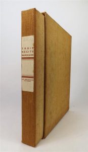 LE GLAY (Maurice). TROIS RECITS MAROCAINS. Paris, Les Bibliophiles du Maroc, 1930. In-4°, en feuilles sous chemise, étui en rafia de l'éditeur. Jolie édition agrémentée de nombreuses belles aquarelles in-texte et à pleine page par ABASCAL. Tirage à 150 exemplaires numérotés sur Arches, celui-ci n°92, enrichi de deux projets de reliure de Creuzevault. Petits défauts à l'emboitage, piqures sur la chemise sinon bon exemplaire.