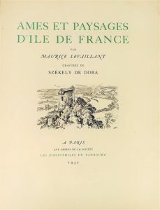 LEVAILLANT (Maurice). AMES ET PAYSAGES D'ILE DE FRANCE. Paris, Les Bibliophiles du faubourg, 1932. In-4° en feuilles sous chemise et étui de l'éditeur. 30 eaux-fortes originales de Székely de Doba, dont une vignette de titre, 9 illustrations dans le texte et 20 à pleine page. Tirage à 110 exemplaires numérotés sur vélin de Lana, celui-ci n° 40, nominatif. Bon exemplaire.