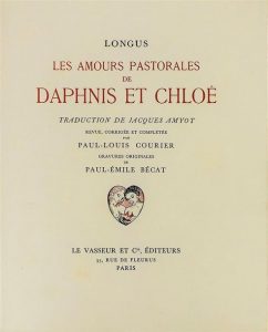 LONGUS. LES AMOURS PASTORALES DE DAPHNIS ET CHLOE. Paris, Le Vasseur, 1939. In-4°, en feuille sous couverture, chemise et étui de l'éditeur. Orné de nombreuses compositions en couleurs dont un frontispice et 16 hors-texte de BECAT. Tirage à 425 exemplaires, celui-ci L'UN DES 25 DE COLLABORATEURS hors commerce numérotés sur Arches, enrichi de 3 planches supplémentaires en deux états, d'un état en noir avec remarques de toutes les gravures et d'une suite en noir des bois gravés. Menus défauts à l'emboitage sinon bon exemplaire.