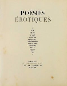 LOUYS (Pierre). POESIES EROTIQUES d'un auteur célèbre illustré de 32 lithographies originales dessinées par un artiste inconnu. Barcelone, Atarazanas (Barrio Chino), l'An I de la république catalane (Paris, Bonnel, 1932). In-4°, en feuilles sous couverture rempliée. Tirage unique à 165 exemplaires et 1er tirage des 32 lithographies très libres de VERTES. L'exemplaire, numéroté 36 sur Hollande Van Gelder est bien complet des 32 gravures, ce qui est rare, car plus de la moitié des exemplaires n'en comporte que 31. Rares rousseurs. (Dutel, 2228).