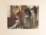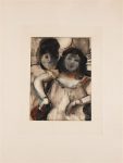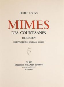 LOUYS (Pierre). MIMES DES COURTISANES. Illustrations d'EDGAR DEGAS. Paris, Ambroise Vollard, 1935. In-4° en feuilles, couvertures rempliées de l'éditeur. Traduction de Pierre Louys illustrée de 4 planches en noir, de 22 gravures sur cuivre dont 3 des 4 planches en couleurs sont tirées sur Japon. Tirage unique à 325 exemplaires numérotés sur Rives, les planches ont été rayées après le tirage. Bel exemplaire.